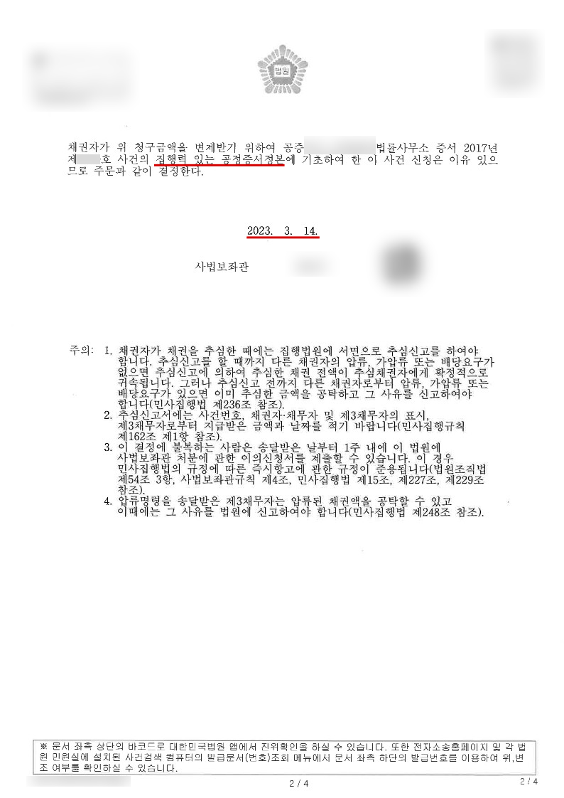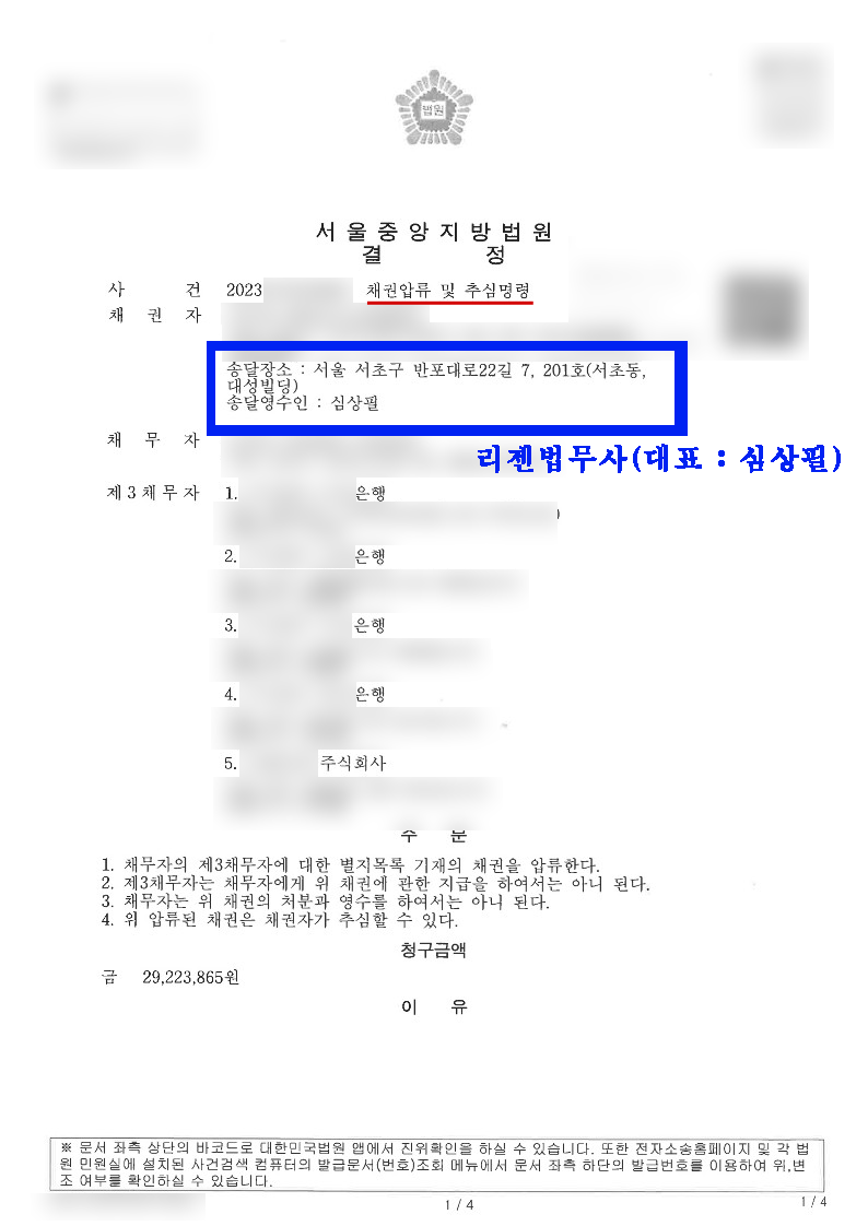 계약서도 각 각 있었기 때문에 채권압류 및 추심명령 신청도 따로 넣어 모두 10일내에 결정됬습니다.